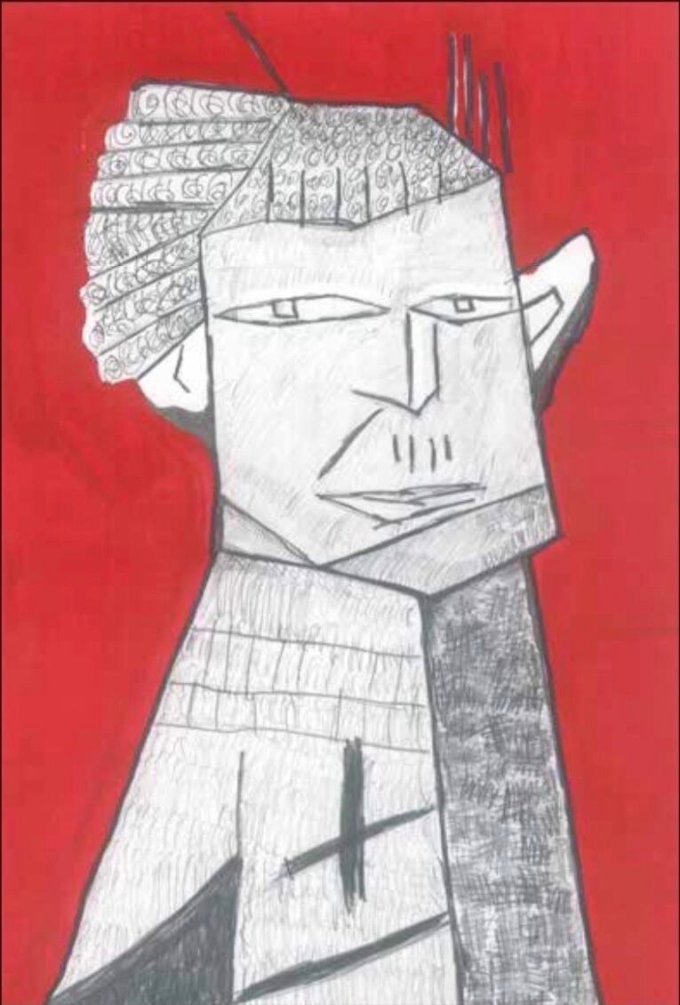 背景が赤くモーツァルトの服をイメージしたポストカードです。